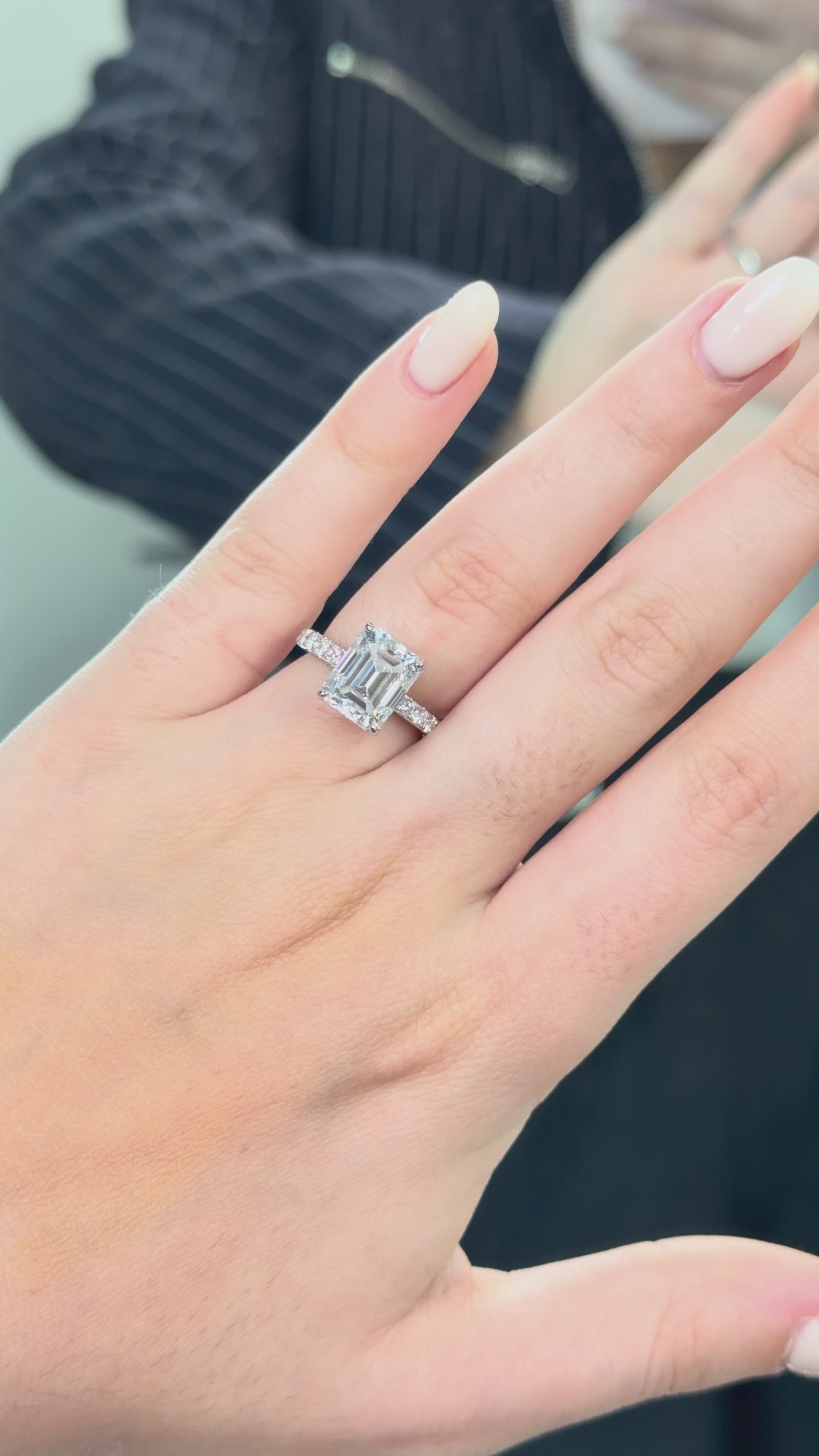 This emerald cut stone is exceptionally clean and bright, featuring a crisp white color and outstanding clarity. Designed to deliver a high-end look with elegant step-cut facets, this ring offers a bold yet timeless presence.