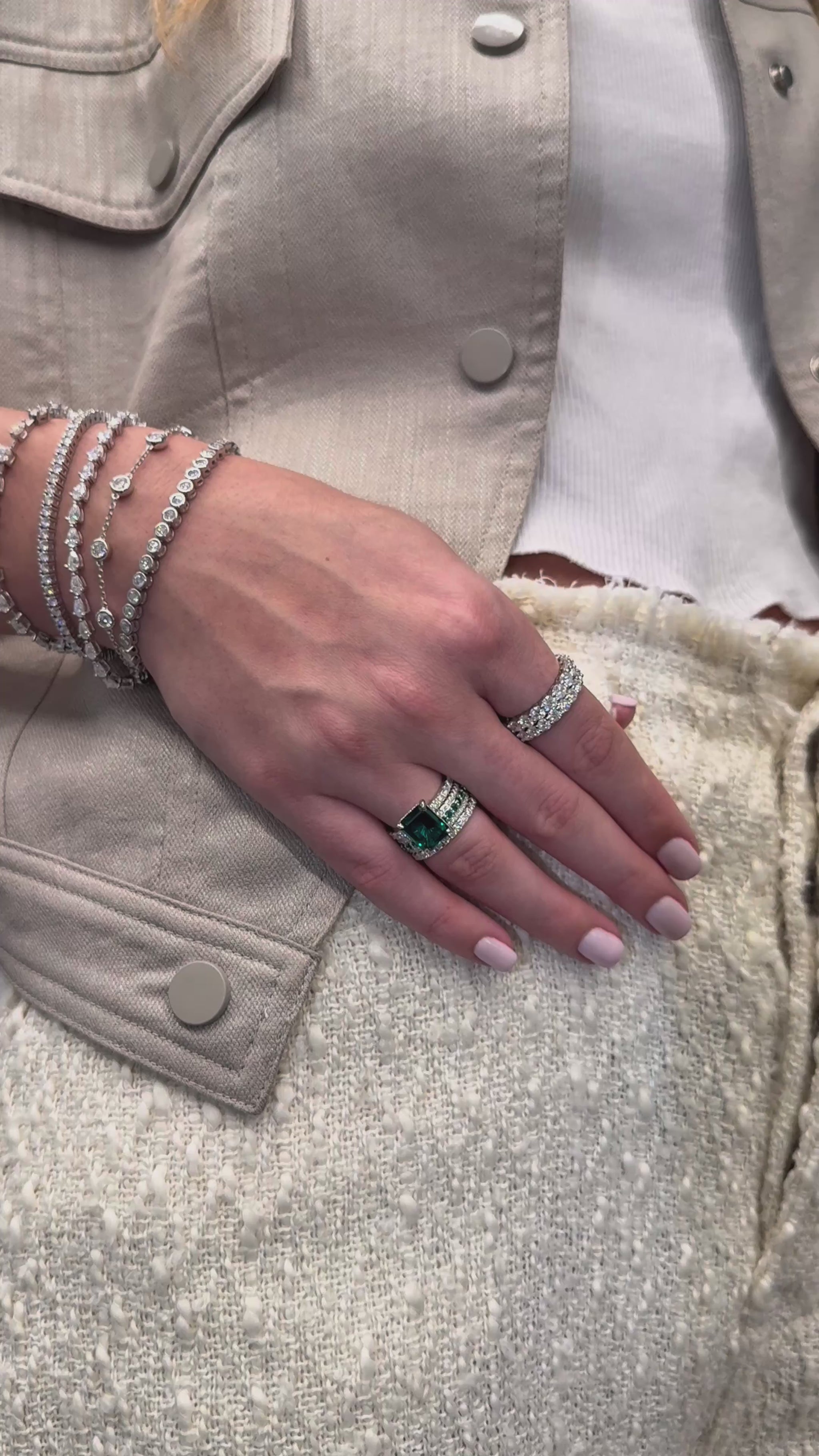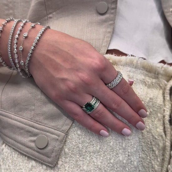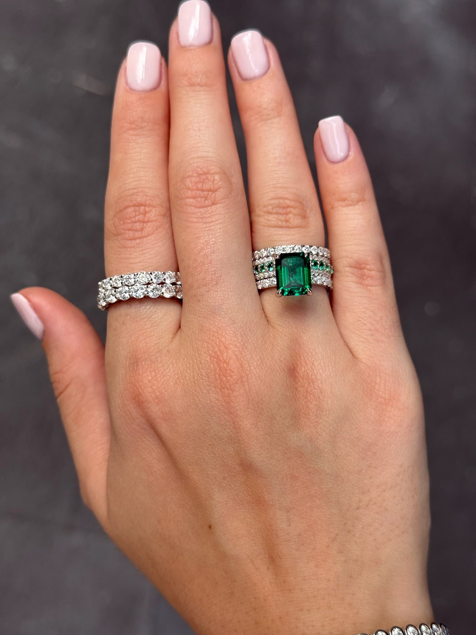 A ring full of elegance and depth . This design showcases a bold 8x10mm (~4ct) emerald-cut lab-grown emerald in a rich dark green hue, complemented by a sparkling band of moissanite accents. The deep green gemstone captures timeless sophistication, while the moissanite side stones bring unmatched brilliance.