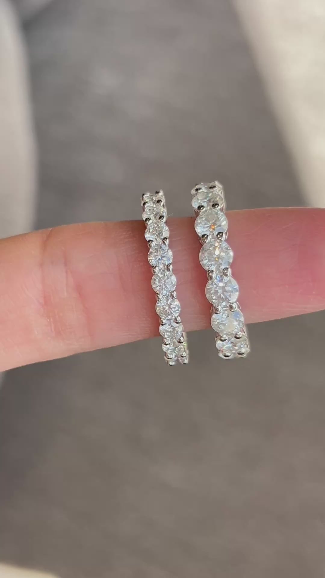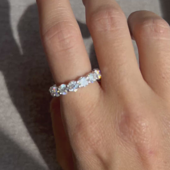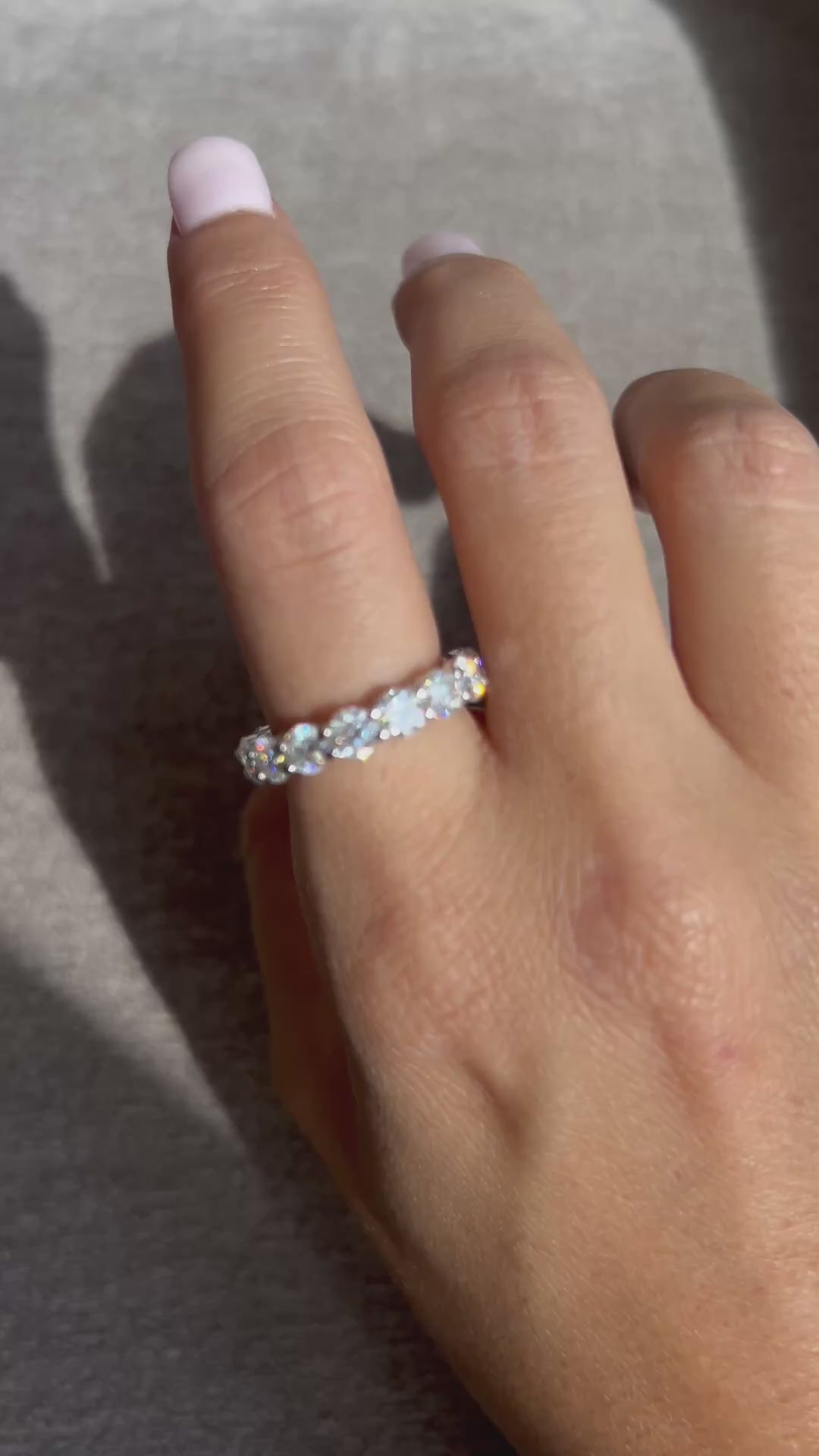 A true showstopper. This 5 carat eternity band features a full circle of 4mm round-cut moissanite stones, each hand-set to maximize brilliance and fire. With its bold presence and timeless elegance, this ring is perfect as a statement piece you’ll reach for every day.Crafted in 925 sterling silver with 18k white gold vermeil (triple layer), it balances durability with luxury, making it a forever favorite in any jewelry collection.