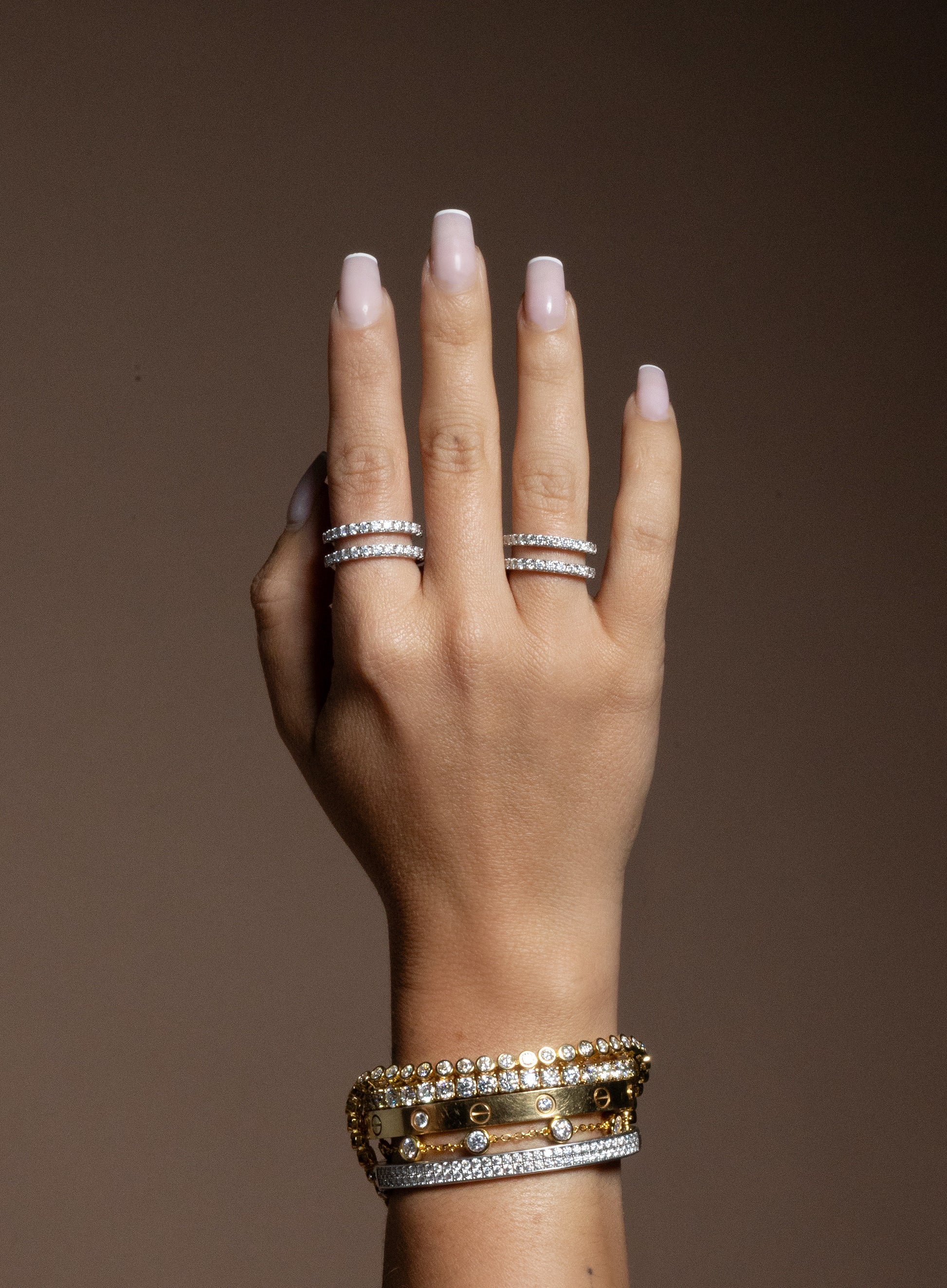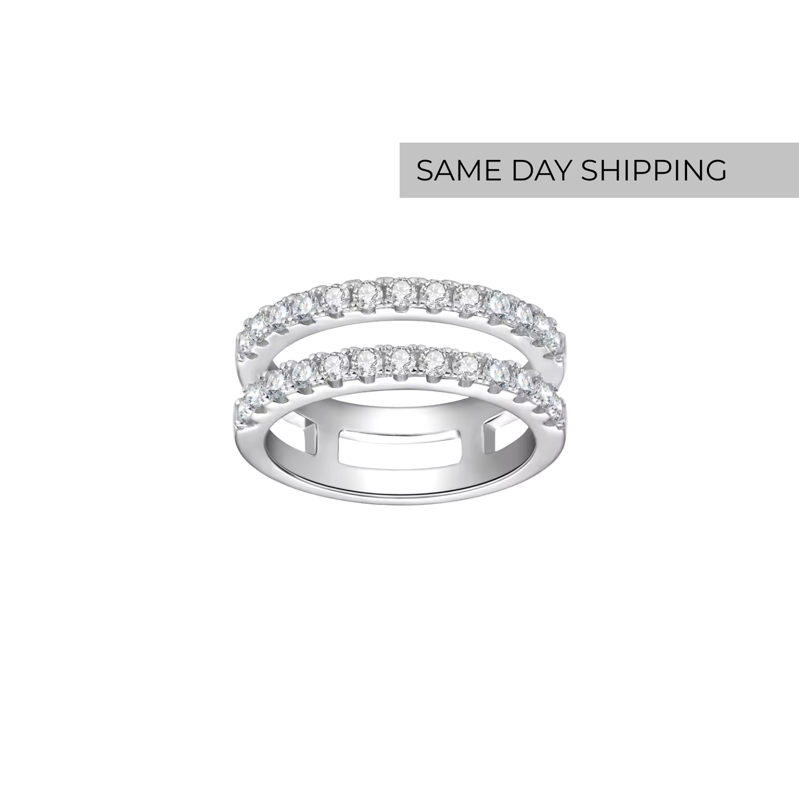 A modern twist on a classic. This open band design features two rows of sparkling 2 mm round-cut moissanites, giving you that stacked look in one sleek piece. At 7 mm wide, it’s bold enough to catch the light but still comfortable for everyday wear.