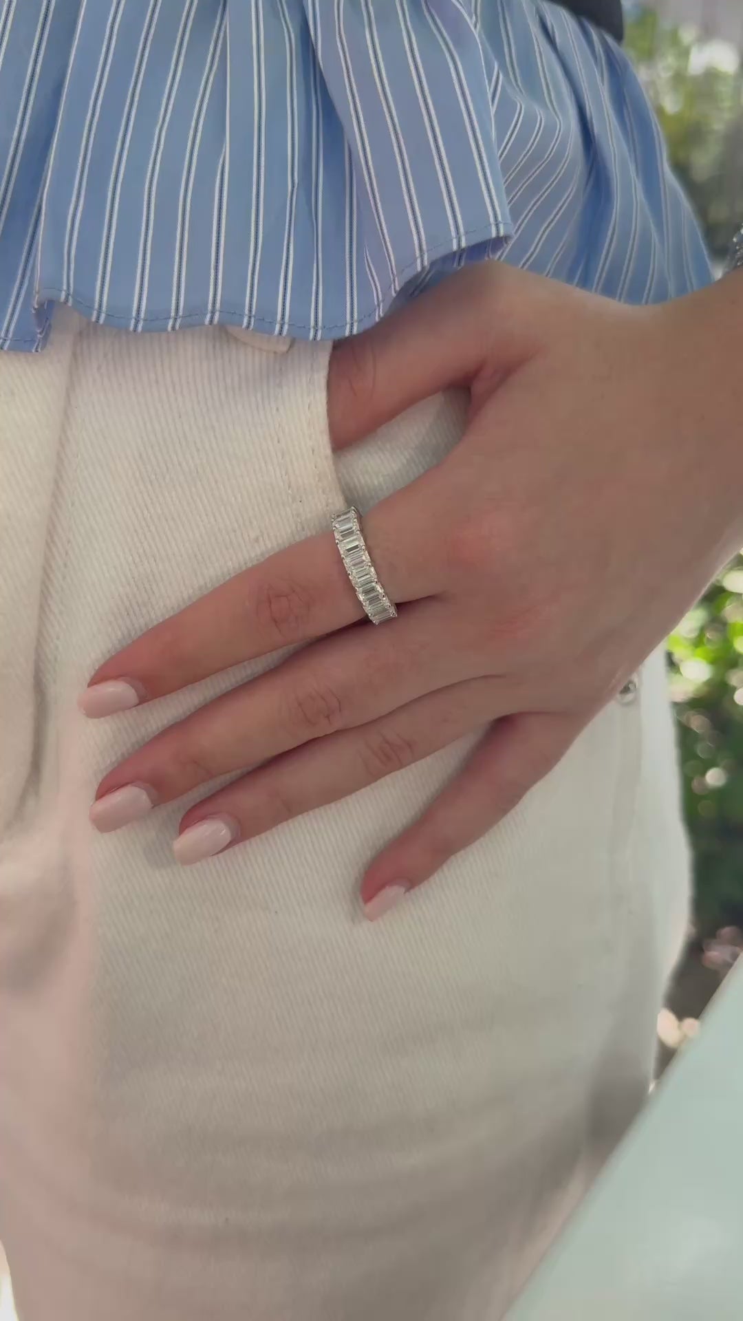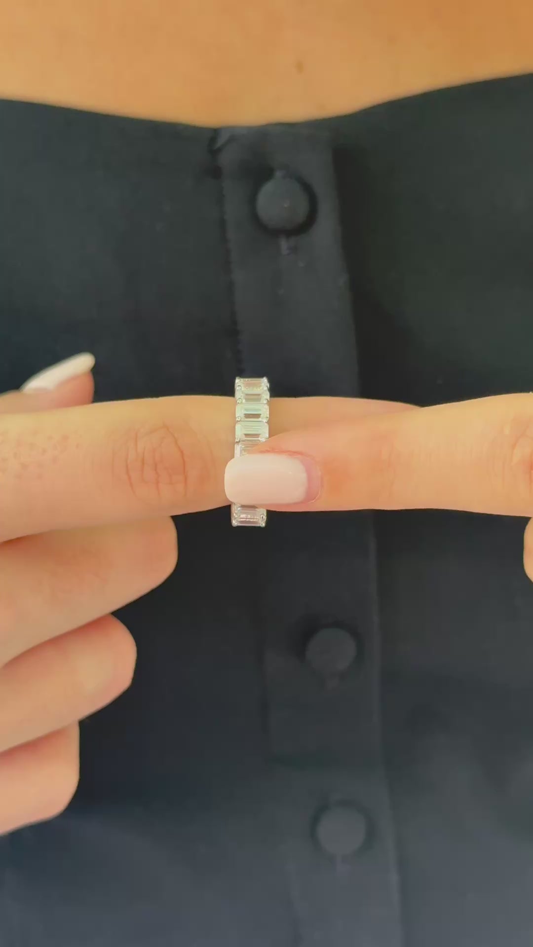 A modern classic designed to turn heads — this eternity band features emerald-cut moissanites that deliver a bold, elegant sparkle.