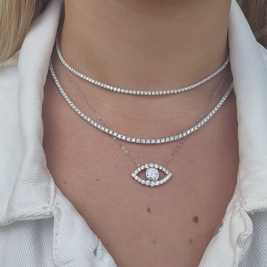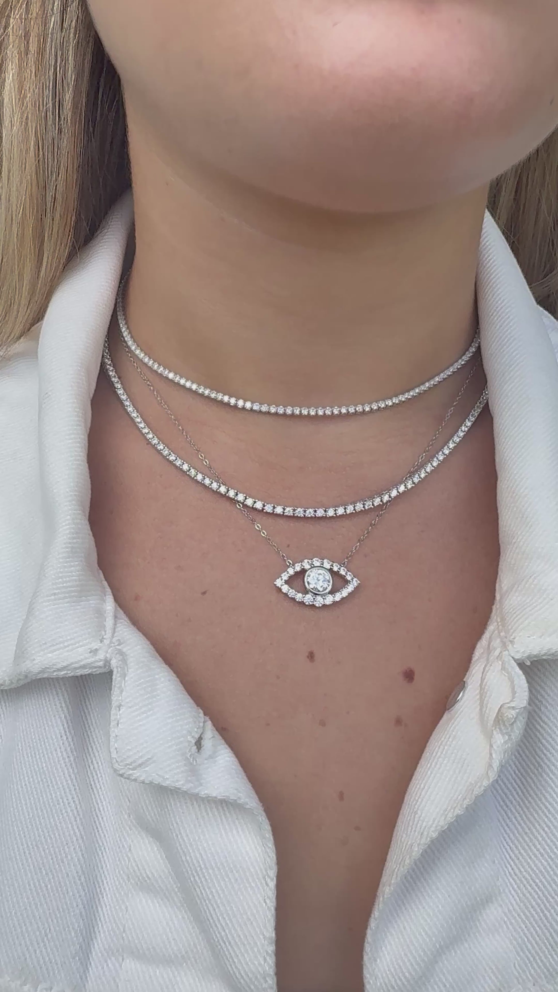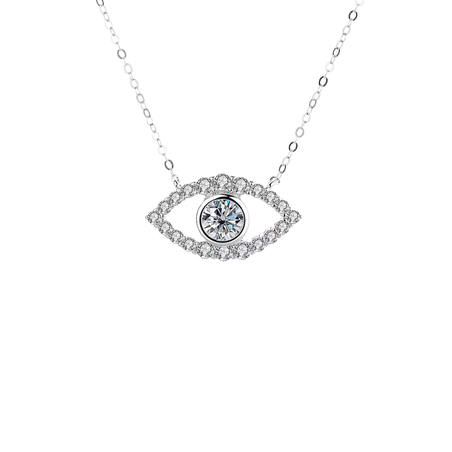 A modern protective Evil Eye necklace featuring a brilliant 1ct round moissanite center stone bezel set and surrounded by a sparkling halo of moissanite. Its sleek design and perfect proportions make it an elegant piece for everyday wear or as a meaningful gift.