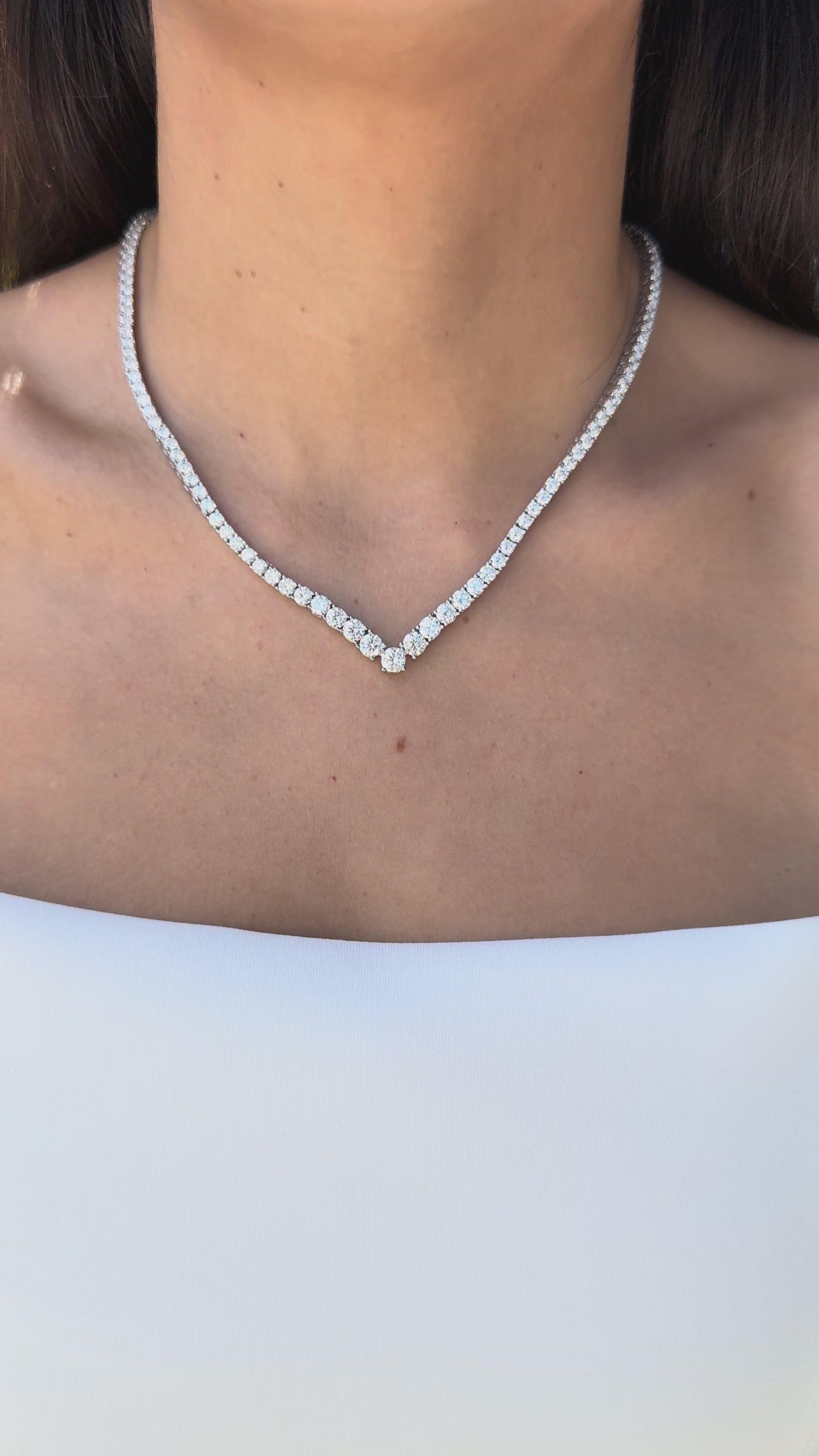 A refined upgrade of the classic tennis style — this new “V” design necklace features a graduated setting that subtly transitions from 0.1ct to 0.5ct stones, creating a natural contour that highlights the neckline.