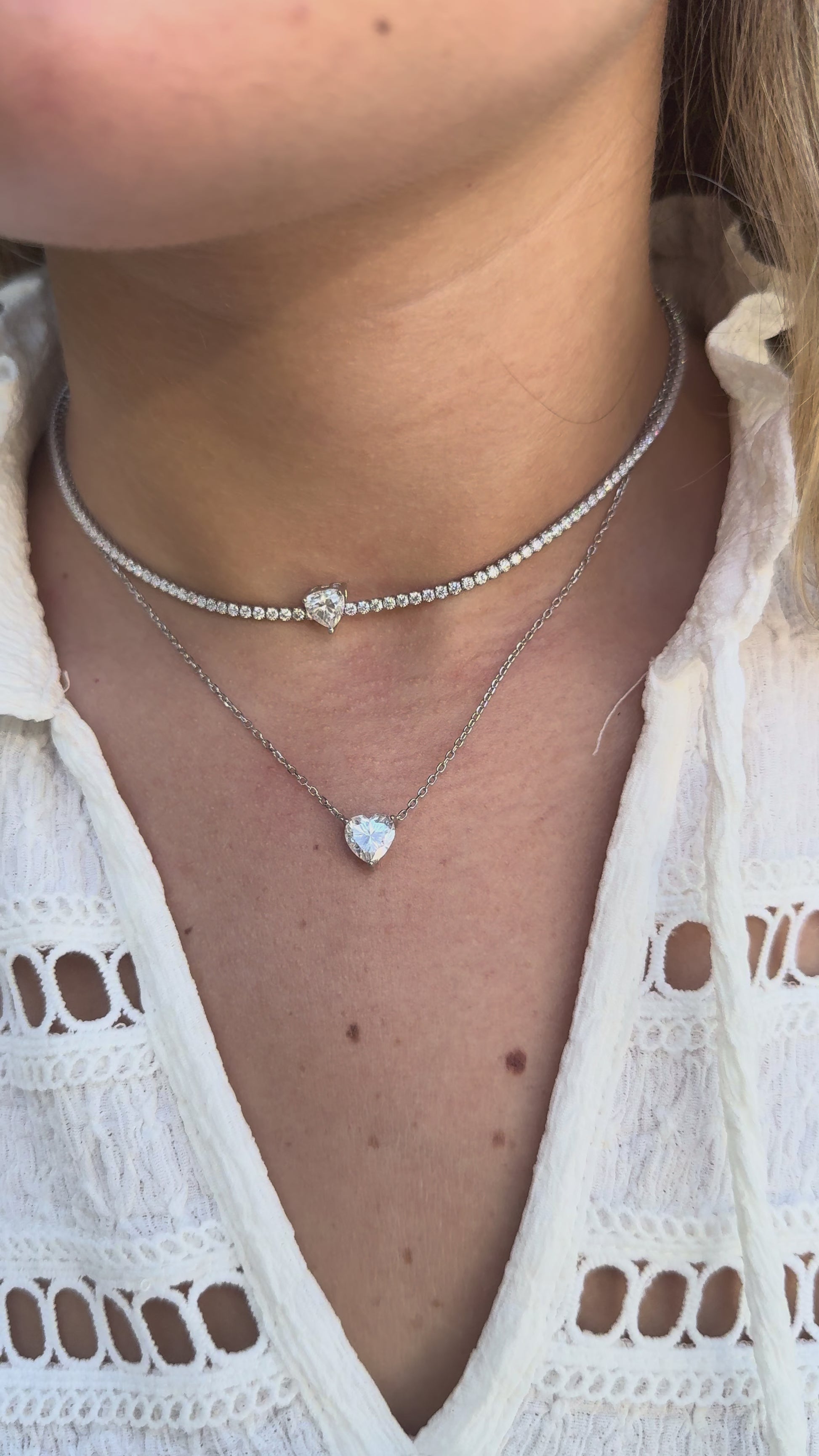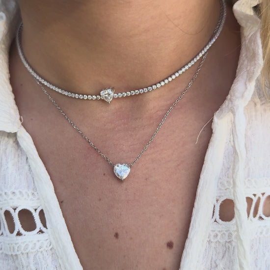 This tennis choker features 3mm round-cut moissanite stones set in a sleek four-prong design, leading to a stunning 1ct heart-shaped center stone that steals the spotlight.