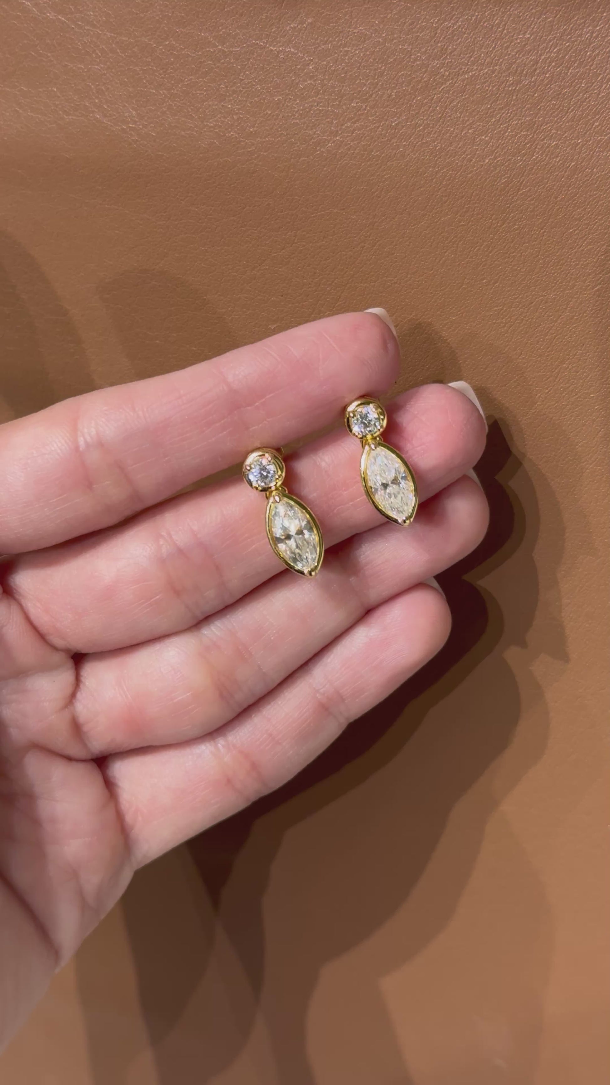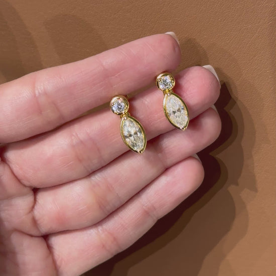 A timeless blend of elegance and modern design, these earrings feature a brilliant round-cut moissanite at the top, gracefully suspending a striking marquise-cut stone below. Set in lustrous 14k gold vermeil over solid 925 sterling silver, the design enhances the sparkle from every angle. With their refined silhouette and radiant fire, they’re perfect for elevating any look, day or night.