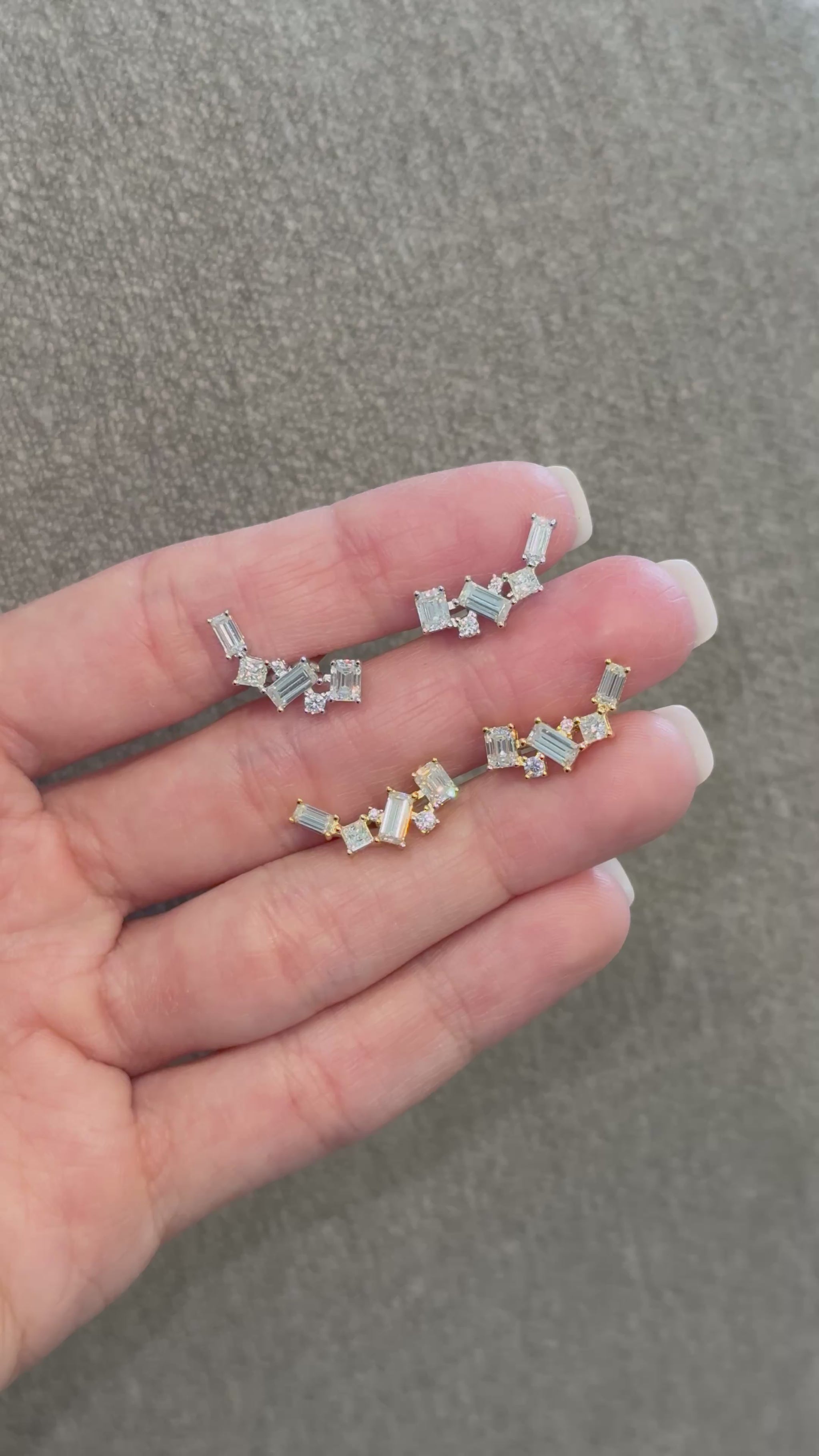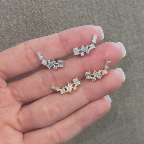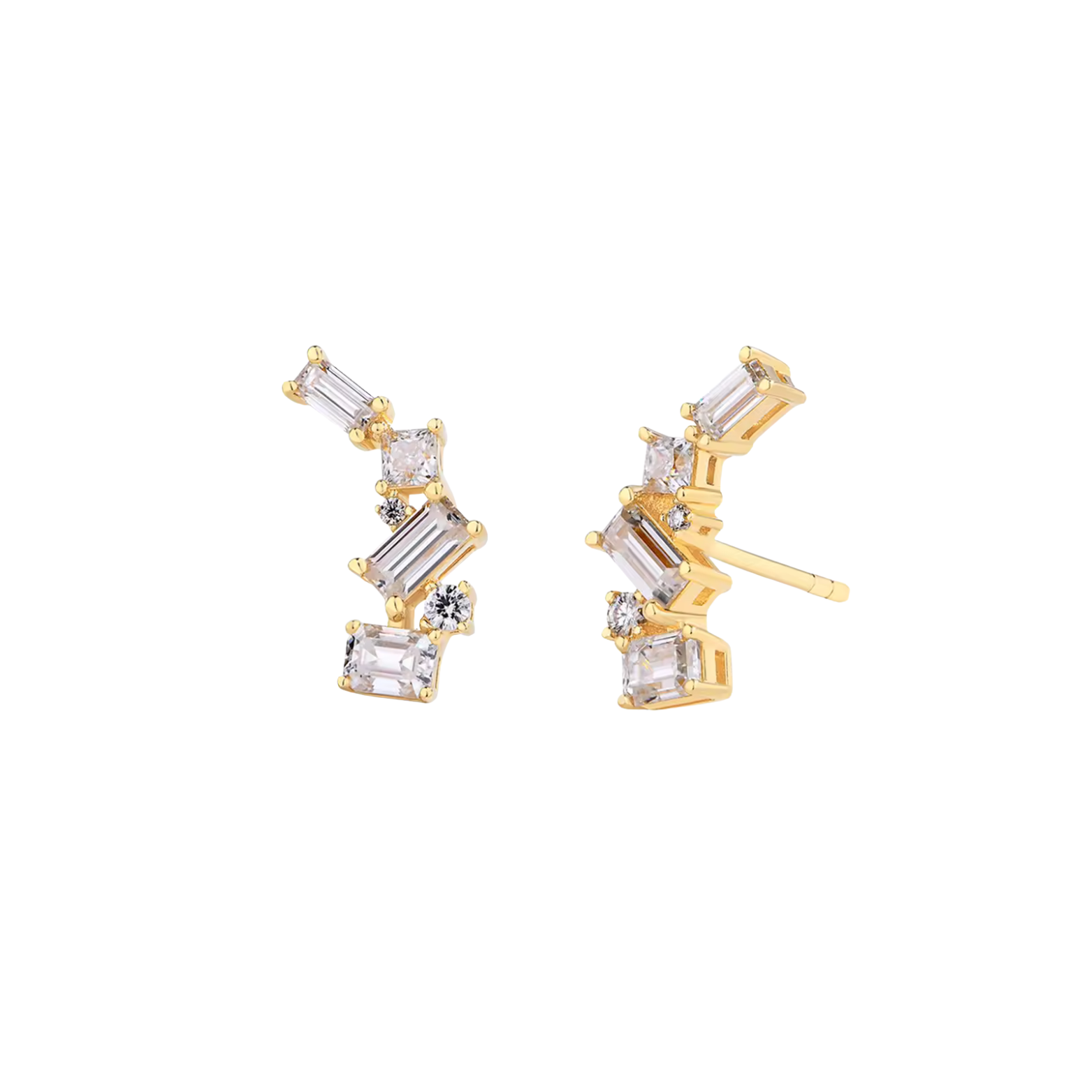 A modern take on sparkle. These ear climbers combine a unique mix of octagon, baguette, princess, and round-cut moissanites, all set in a chic gold vermeil finish. Their geometric design adds edge while the brilliance of the stones keeps them timeless.