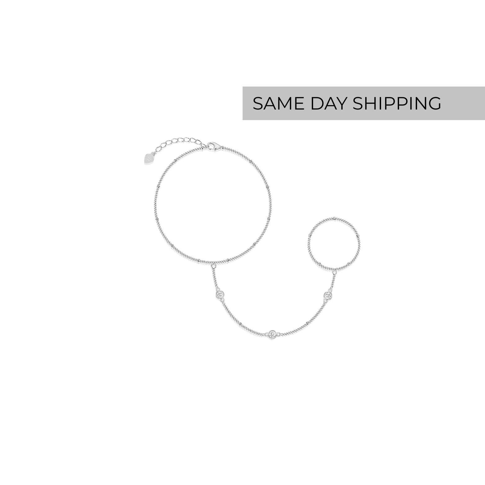 Delicate, sparkly, and super chic. Our hand chain features three 3mm moissanite stones that shine like real diamonds. Made in 925 sterling silver with 18k white gold plating, it connects from your wrist to your finger for that effortless glam look. Adjustable from 14 to 21 cm for the perfect fit.