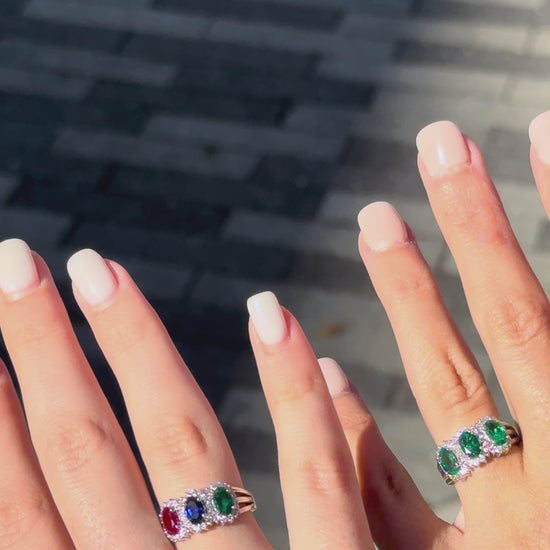 A colorful twist on classic elegance — this three-stone ring features vibrant lab-grown gemstones in your choice of blue sapphire, ruby, emerald, or a mixed combination. Each oval-cut gemstone shines at the center of its own halo of brilliant D color VVS1 moissanites, creating a refined balance of sparkle and color.