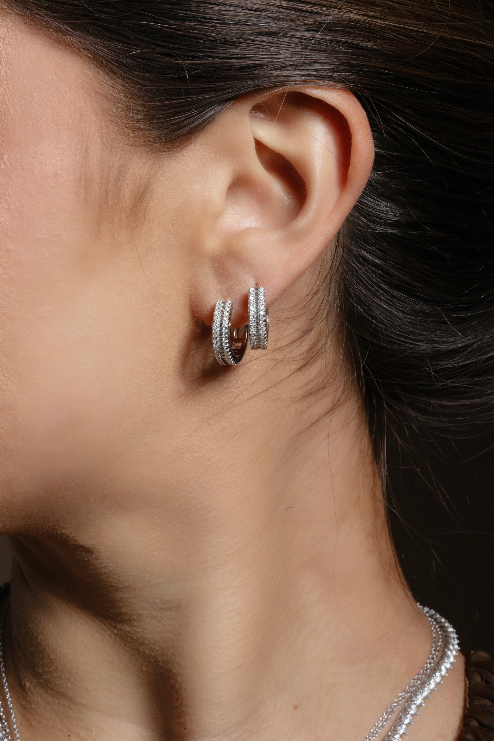 Your new go-to sparkle ✨ These huggies mix baguette and round moissanites in three perfect rows, bold enough to stand out, but sleek enough to wear every day. With a comfy 16 mm size and 4 mm width, they hug your ear with the right amount of shine.