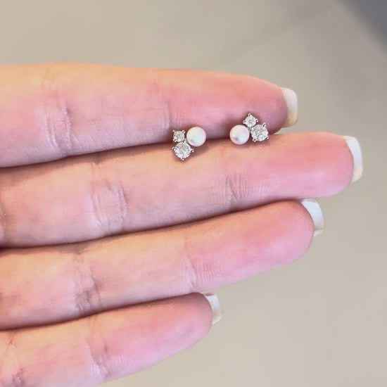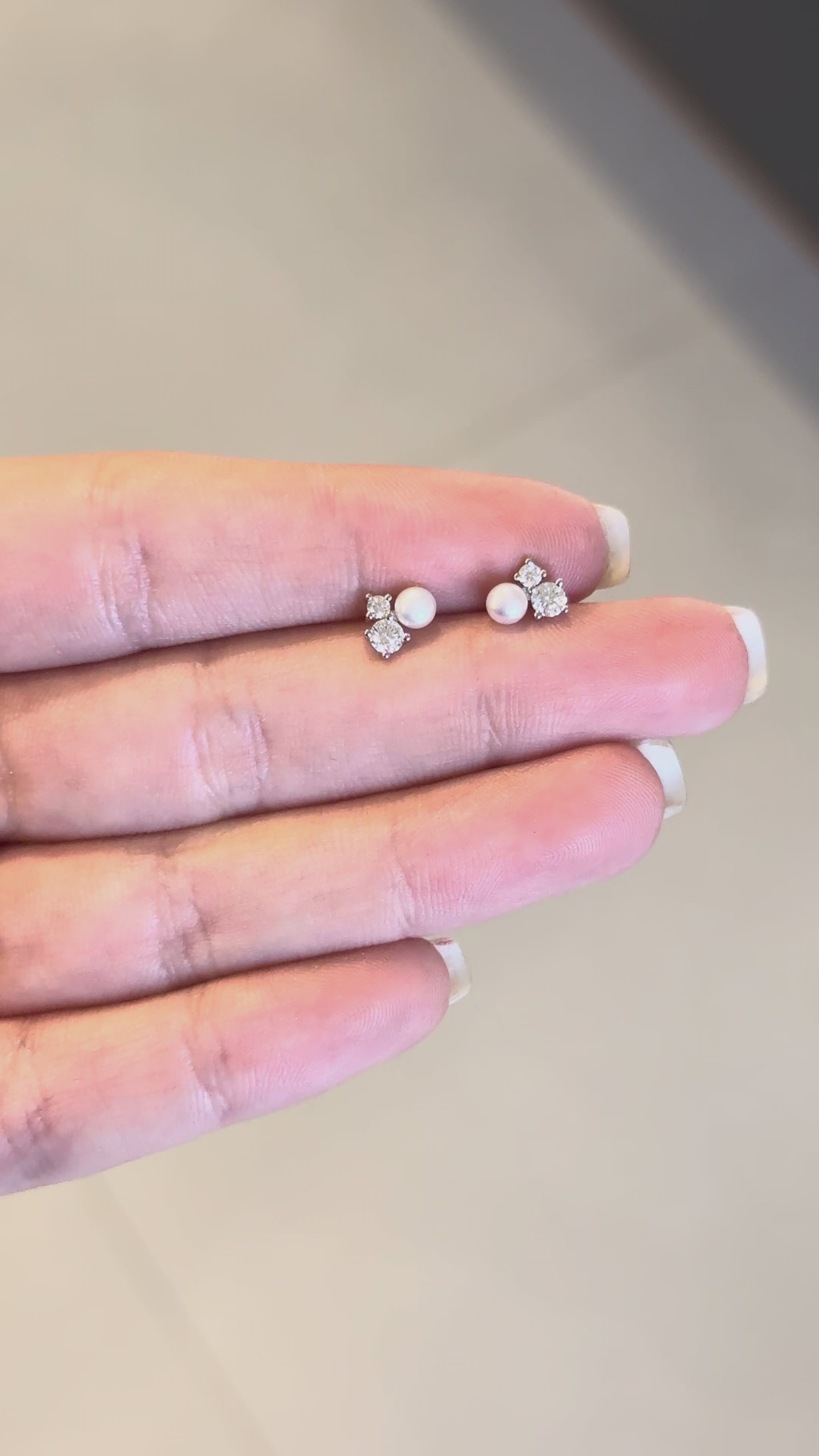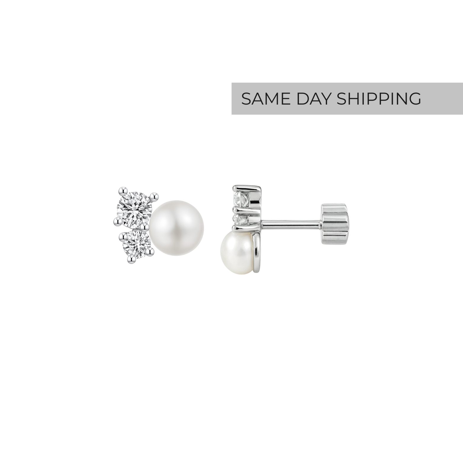 Delicate and luminous, these double moissanite and pearl studs feature two brilliant moissanites paired with a soft, glowing pearl. Their asymmetric sparkle and petite size make them perfect for girls or everyday elegance. Designed with a screw-back closure and flower-shaped back, they offer comfort, security, and a graceful shine from every angle.